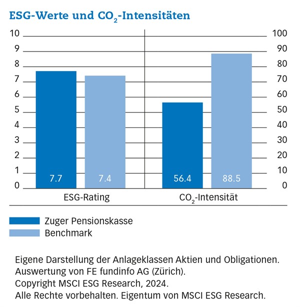 Die ESG-Analyse bestätigt die nachhaltige Anlagestrategie der Zuger Pensionskasse. Die Resultate 2024 zeigen, dass in den Anlagekategorien Aktien und Obligationen rund 4.1% nachhaltiger und mit einer 36% tieferen CO₂-Intensität als der Benchmark investiert wird. Auch in den Anlageklassen Immobilien und Hypotheken zeigen die ermittelten CO₂-Intensitäten tiefere Werte auf als jene der Benchmarks bzw. der Peer-Gruppe.